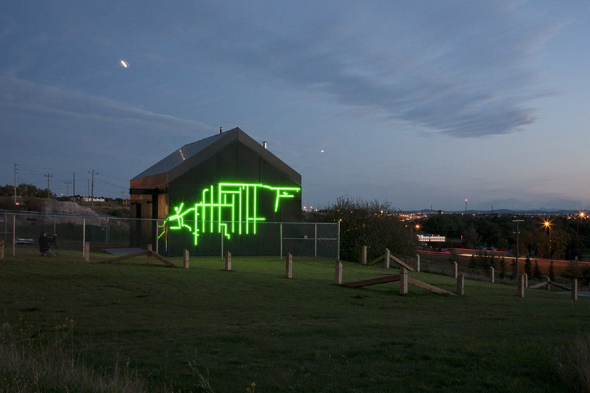 Among the nearly 40 lift stations across Calgary that help move the water we've used from our homes and businesses through 4,500 km of sanitary pipes, Forest Lawn Lift Station is a little different. Embedded in the surface of the station is a lighting system depicting a scaled map of the sanitary pipes of the Forest Lawn community connected to the station. The flow of wastewater varies during the day and the sensors monitoring these variations of flow provide important information for the management of the network. Uniquely, at this station they also control the colour changes of the map to reflect the current flow levels of the system below ground, revealing a hidden aspect of our environment and a system that follows the rhythm of our daily lives. Forest Lawn Lift Station was created through the award-winning Public Art program Watershed+. It fostered a collaborative process between artists, engineers, and other subject matter experts and integrated creativity in the thinking of urban infrastructure. At Forest Lawn, Lead Artists Sans façon worked in collaboration with engineers, architects, and lighting experts to create this lift station, which is both functioning infrastructure and an artwork.