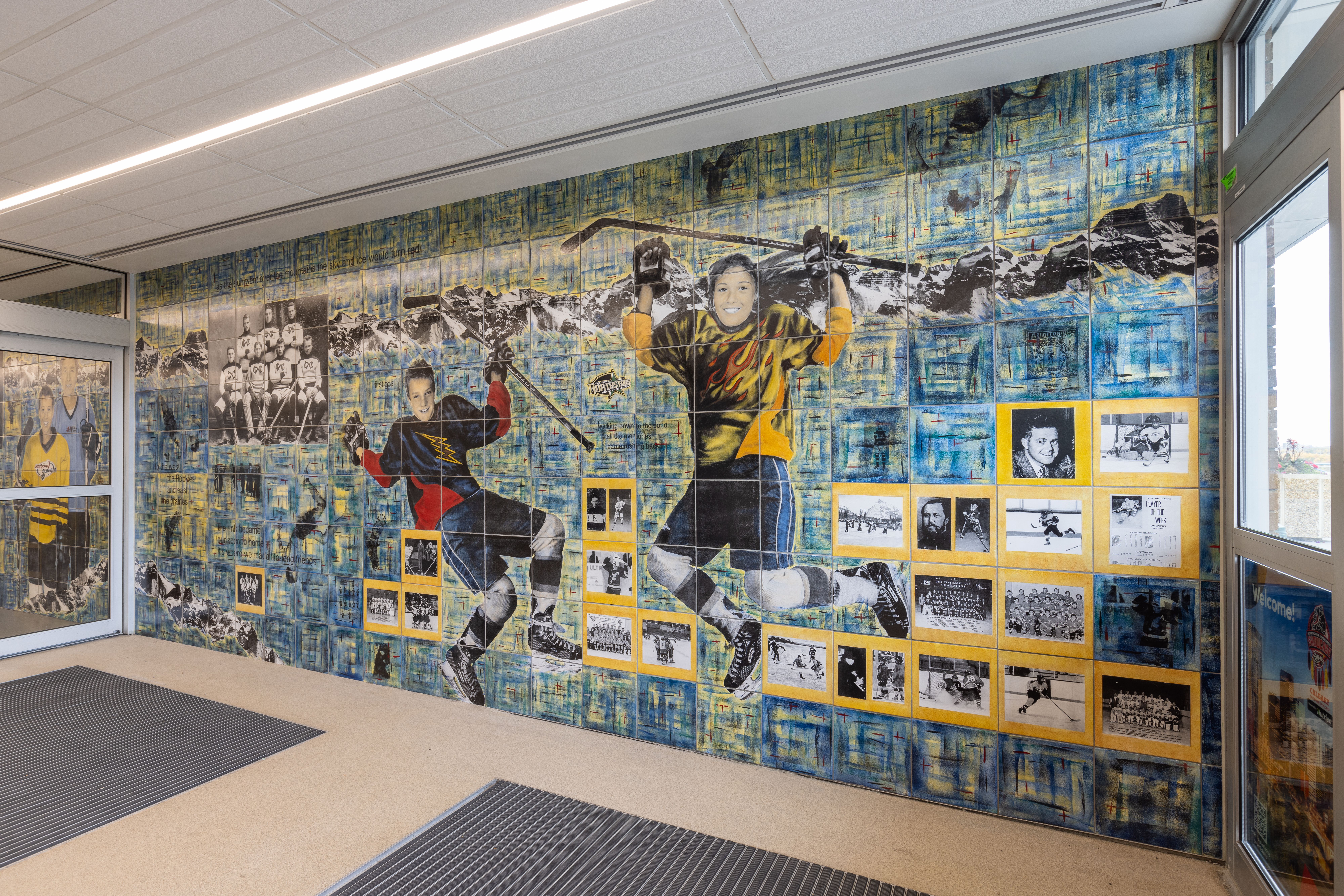 Designed as a welcoming feature, the public artwork is intended to act as a document of the building's history, becoming a community scrapbook through the use of photographs and images provided by local teams and community members. The result is an animated and celebratory experience which reflects the importance of hockey to this site and to Calgary.