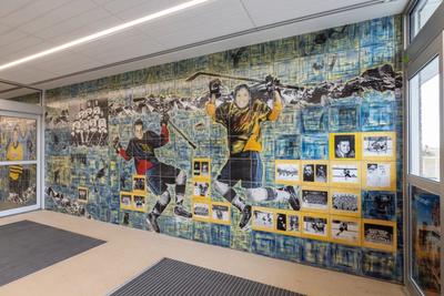 Located in the entry area of the Max Bell Arena, this mural celebrates the sport of hockey.