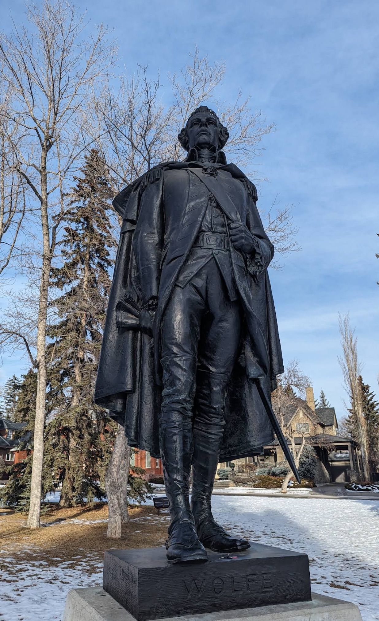 This particular statue of Wolfe, created by Scottish-American sculptor John Massey Rhind in 1898, has travelled somewhat extensively. It was first located in New York, on the Exchange Court building, built by William Waldorf Astor, one of four statues Rhind made for that location. Calgary philanthropist Eric Harvie eventually purchased the statue of Wolfe, which in 1967 was placed outside of Calgary's newly constructed planetarium. This placement was not without controversy: it was argued that the planetarium was not necessarily the best fit for an 18th-century officer. It has since been relocated to what is perhaps its most fitting location: Calgary's South Mount Royal Park, which is bounded by Wolfe Street, Montcalm Crescent, and Quebec Avenue.