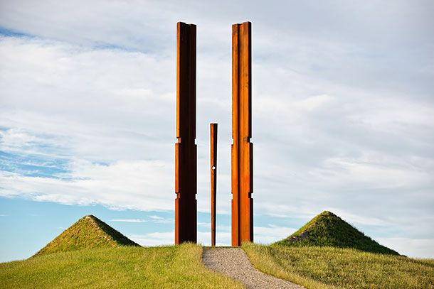 From a distance, visitors to Ralph Klein Park will notice three monolithic sculptures rising above two pyramid-like mounds. This is Hawk Hill Calgary Sentinels.