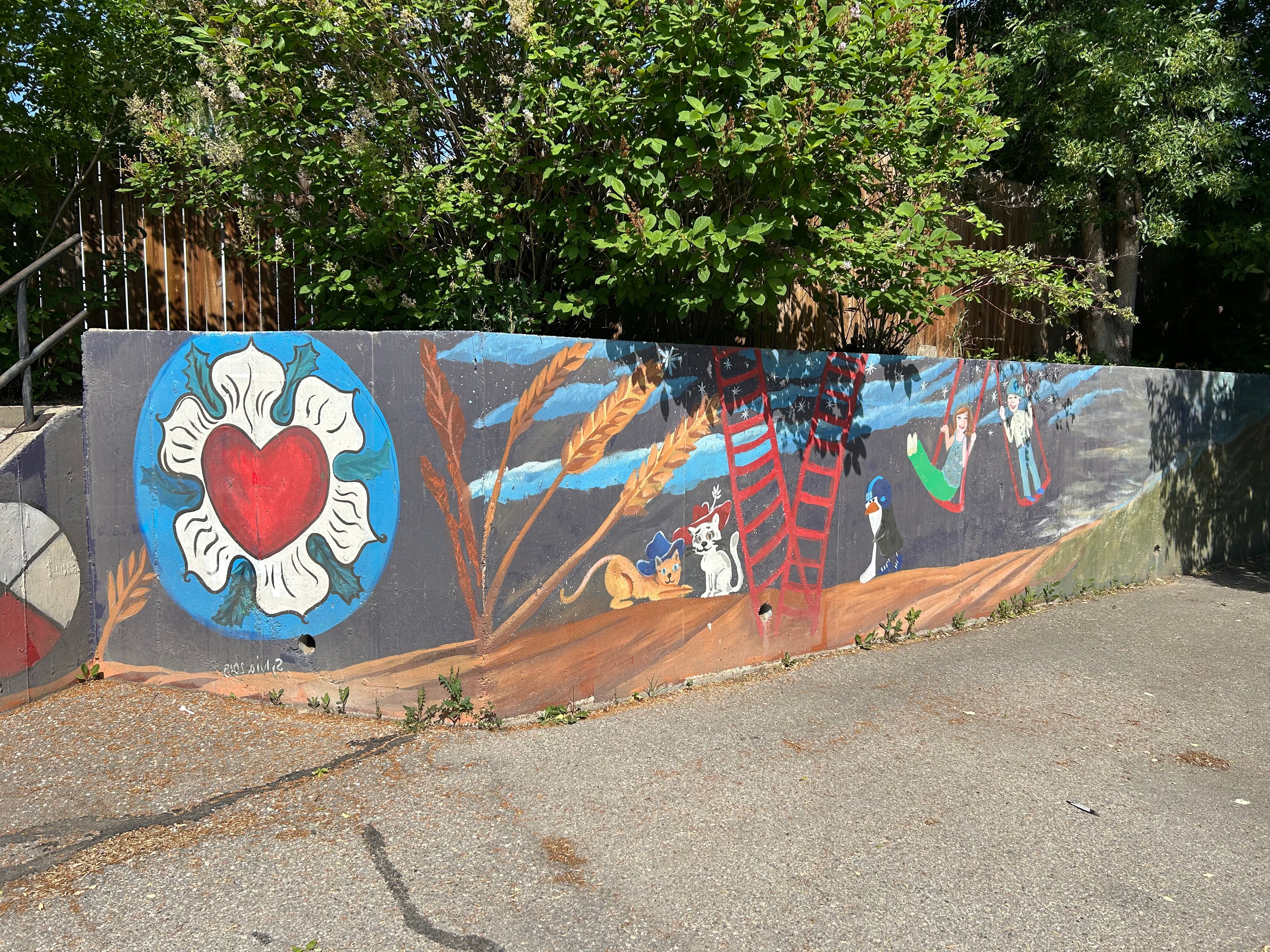 Mural wrapping the parking lot of the Lutheran Church of Our Saviour parking lot.