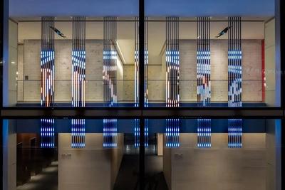 Heralding the dawn of Earth’s Anthropocene period, this artwork incorporates a collection of data feeds to illustrate the interrelationship between human activity in Calgary and the natural system of the Bow Glacier in the Canadian Rockies, which exists in a perpetual state of physical transformation. Inside the lobby, the glacier’s real-time perturbations are visually juxtaposed against the aggregated trajectories of nearby pedestrians and vehicles in a sequence of overlapping visualizations, while outside on the plaza the glacier’s ceaseless activity is made visible and audible, creating a visceral public presence for this restless complex of ice, rock, and water.