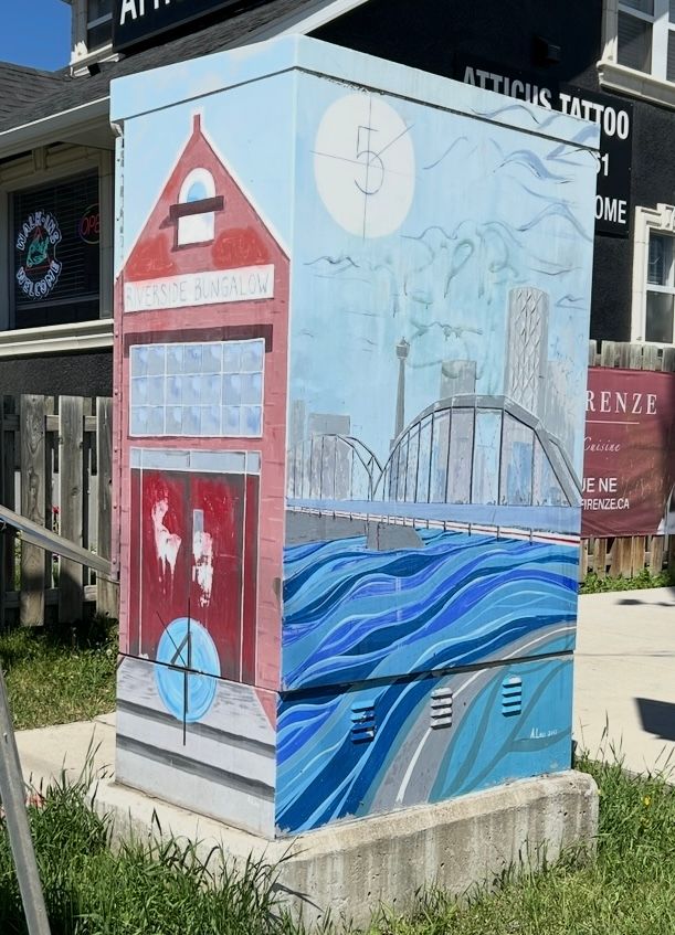 The images painted on the box show historic settings in this 100+ year old community: Reconciliation [Langevin] Bridge, Riverside Bungalow school, the Gerlitz Block.