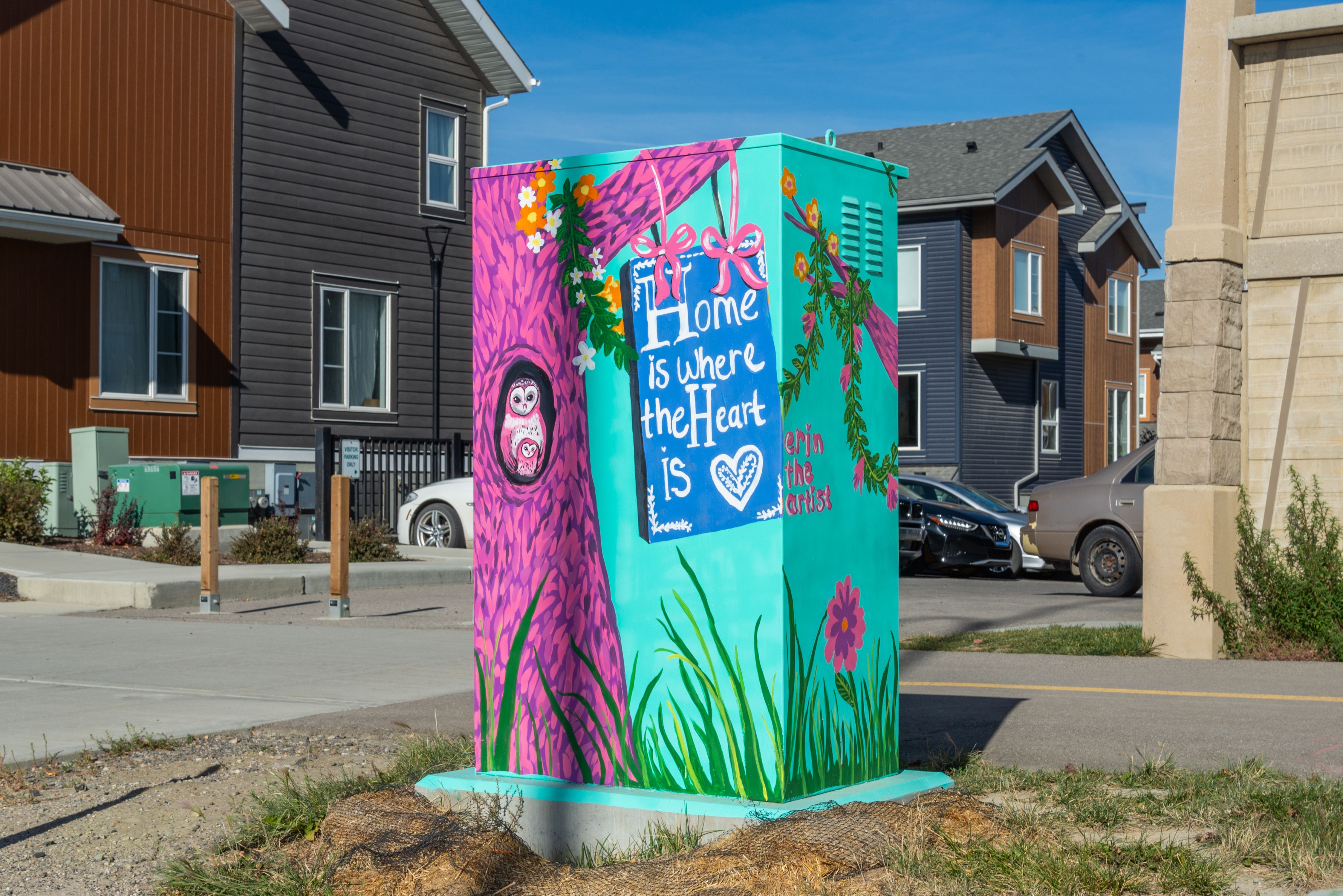This painted utility box is a love letter to the quiet beauty of nature and the unseen threads that weave us together. Birds, perched gently in their nest, cradle their eggs with an instinctive tenderness — an unspoken promise of care, of future, of belonging. Wrapped in the arms of trees and wild blossoms, they become part of something greater, just as we do within our own communities.