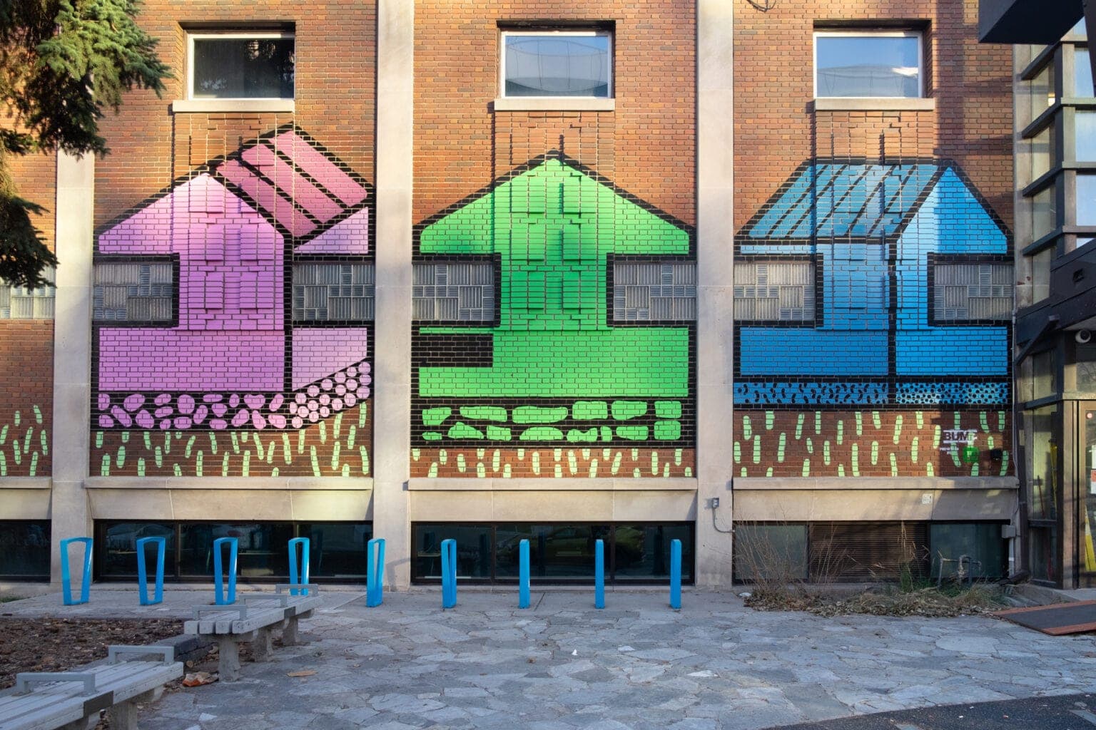 This is a place for the community. Colourful houses adorn the wall to remind us of the feeling of home; a place where we feel safe, comfortable, and welcome. Together the illustrative houses speak of a community, one where every person can feel at home with other members of their community. The homes in their childlike form remind us of our childhood, of playing in the park with our friends, taking risks, and having fun ’till your called home for dinner. This is such a place, a place for the community to play.