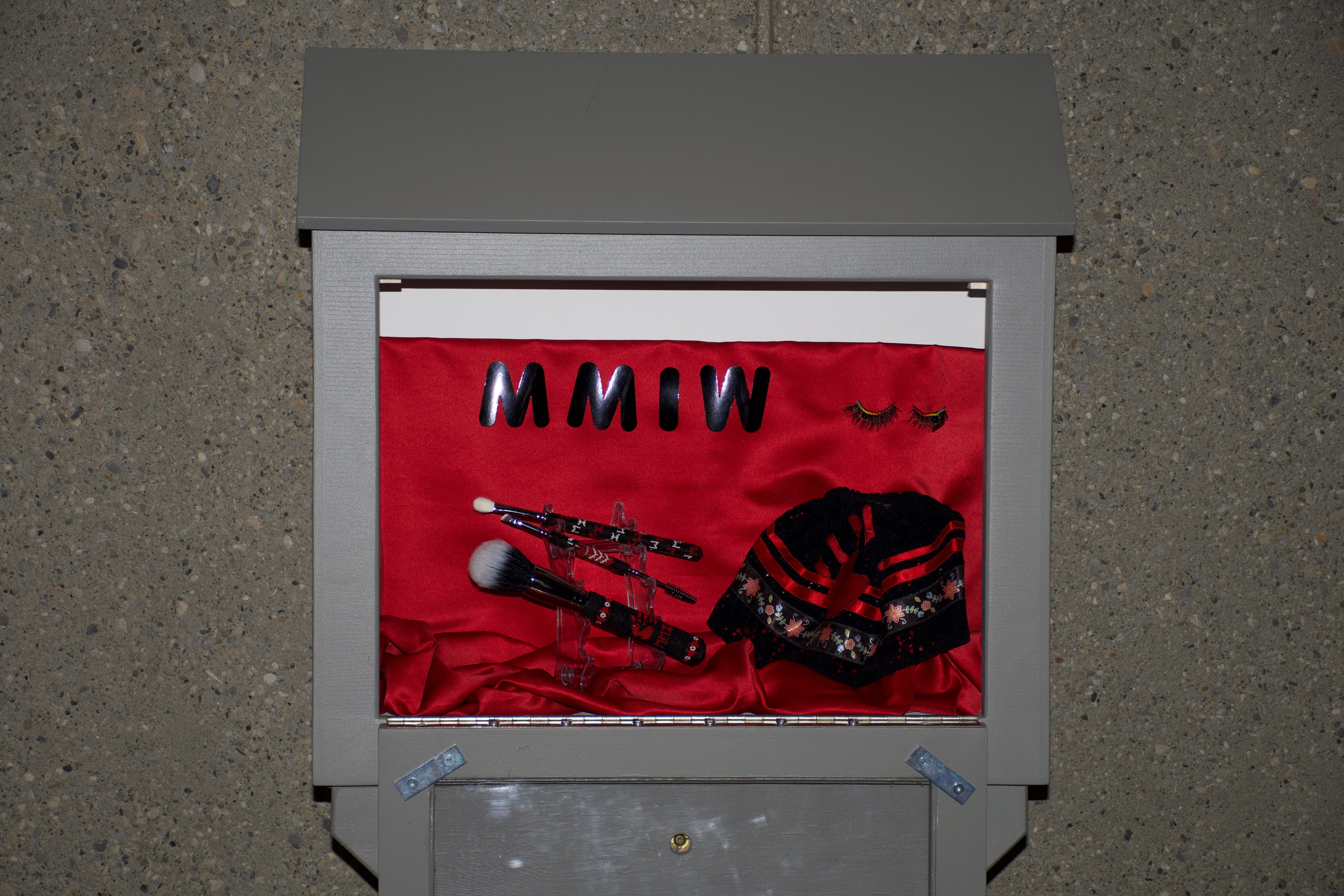 This piece incorporates symbols on makeup brushes that MMIW has adopted over the years to recognize the cause.