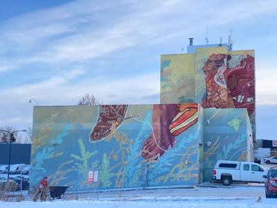 This 5,000 sq ft mural, painted onto the side of the Calgary Dream Centre, explores the meaning of home and the stories of people currently experiencing homelessness. Artist Nicole Wolf drew inspiration from conversations with people in residence at the Dream Centre, who contributed words, ideas, drawings and poetry to inspire the final design.