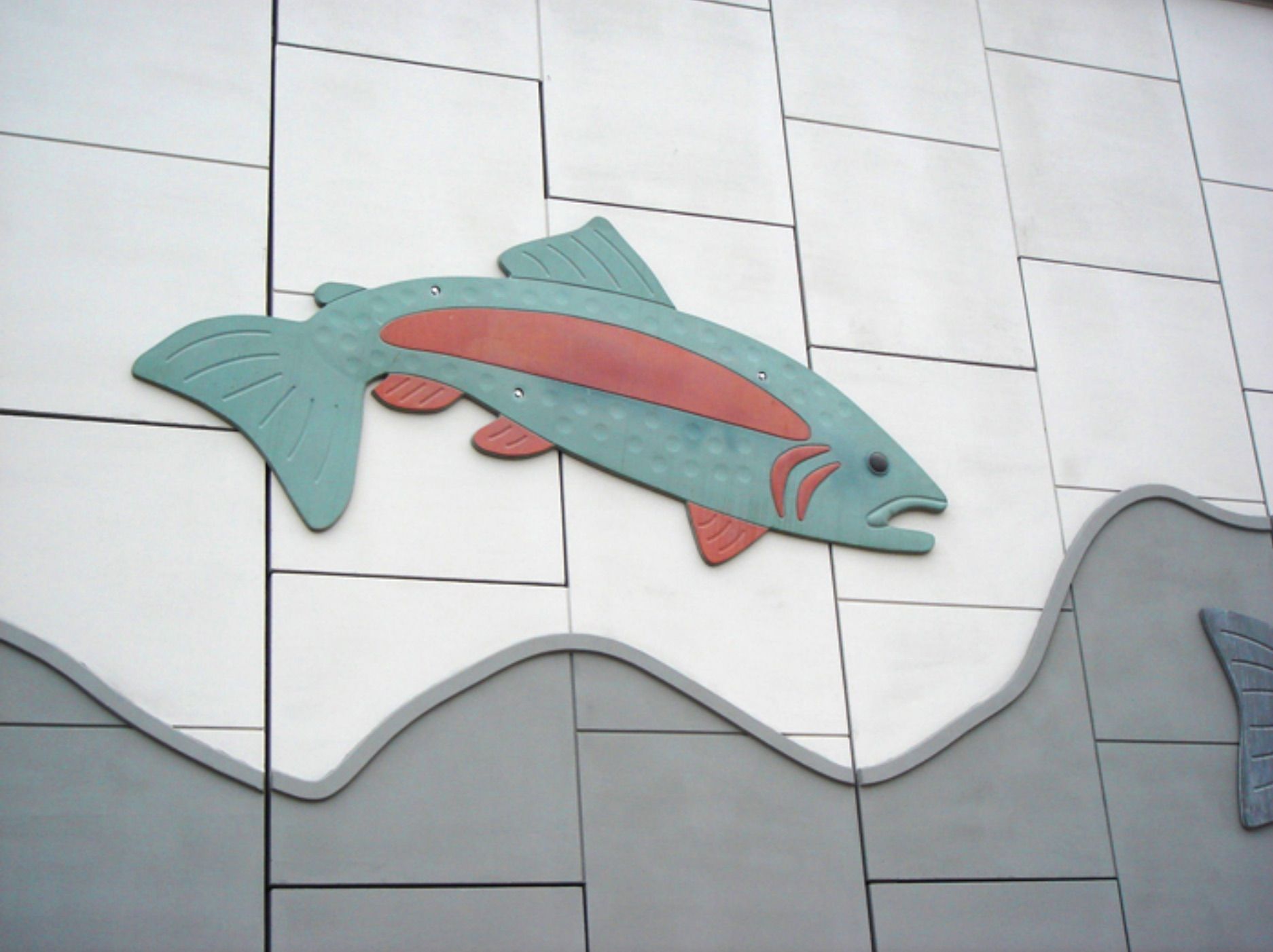 Rainbow trout and Brown trout are just five of the species which inhabit this nearby River, a renowned fly-fishing location. These relief forms are bolted into panels representing the water and the sky. Those jumping are highlighted by their colourful scales reflecting in the sun. Those swimming are muted from the dark water of the river.