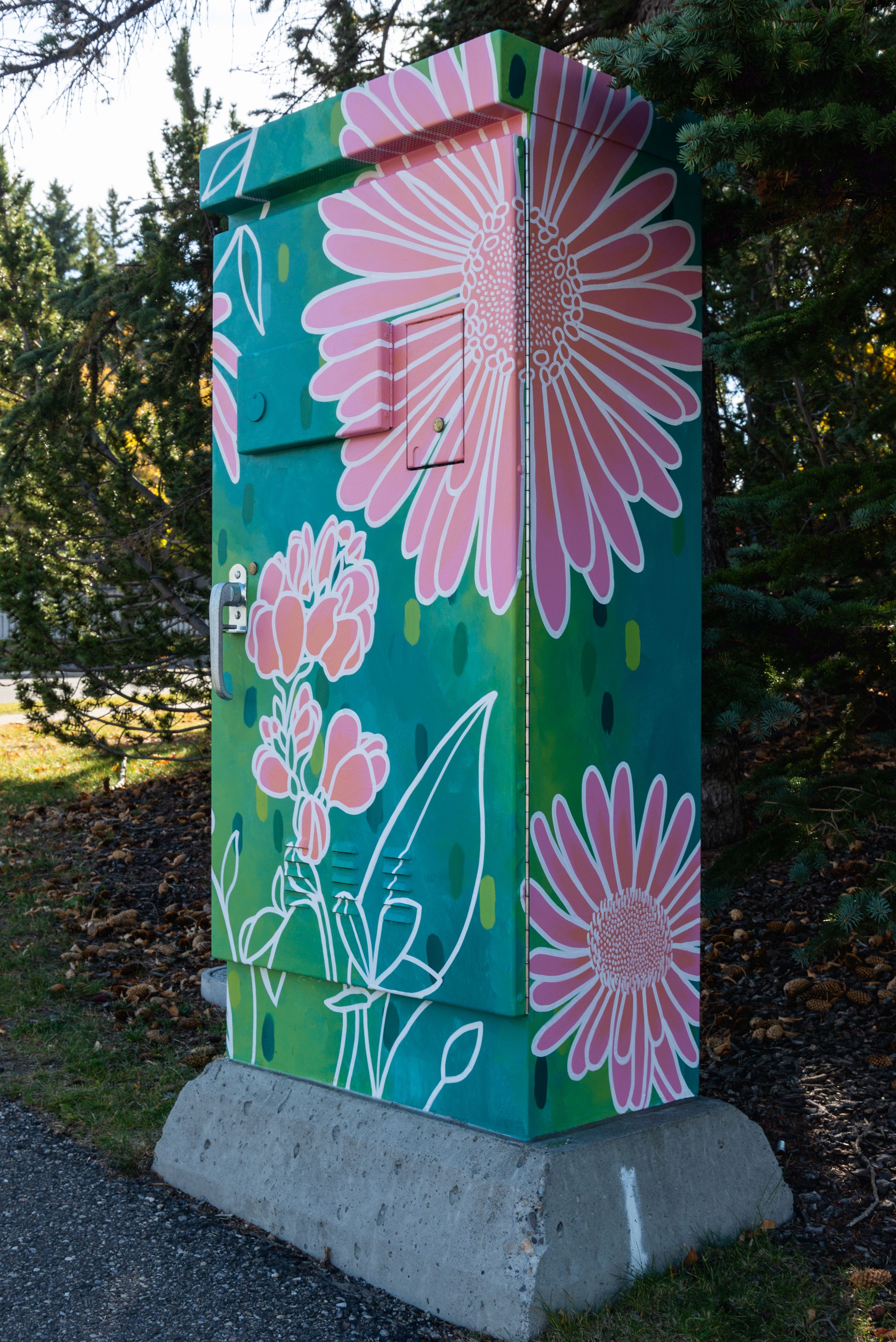 This mural contains plants native to Edgemont, Calgary and Alberta, portraying the importance of local and regional connections. The species include buffalo beans, blue aster, fleabane and Saskatoon berries. The intention of this mural is to bring colour into the community and brighten people’s day, while displaying plants they can find around the area.