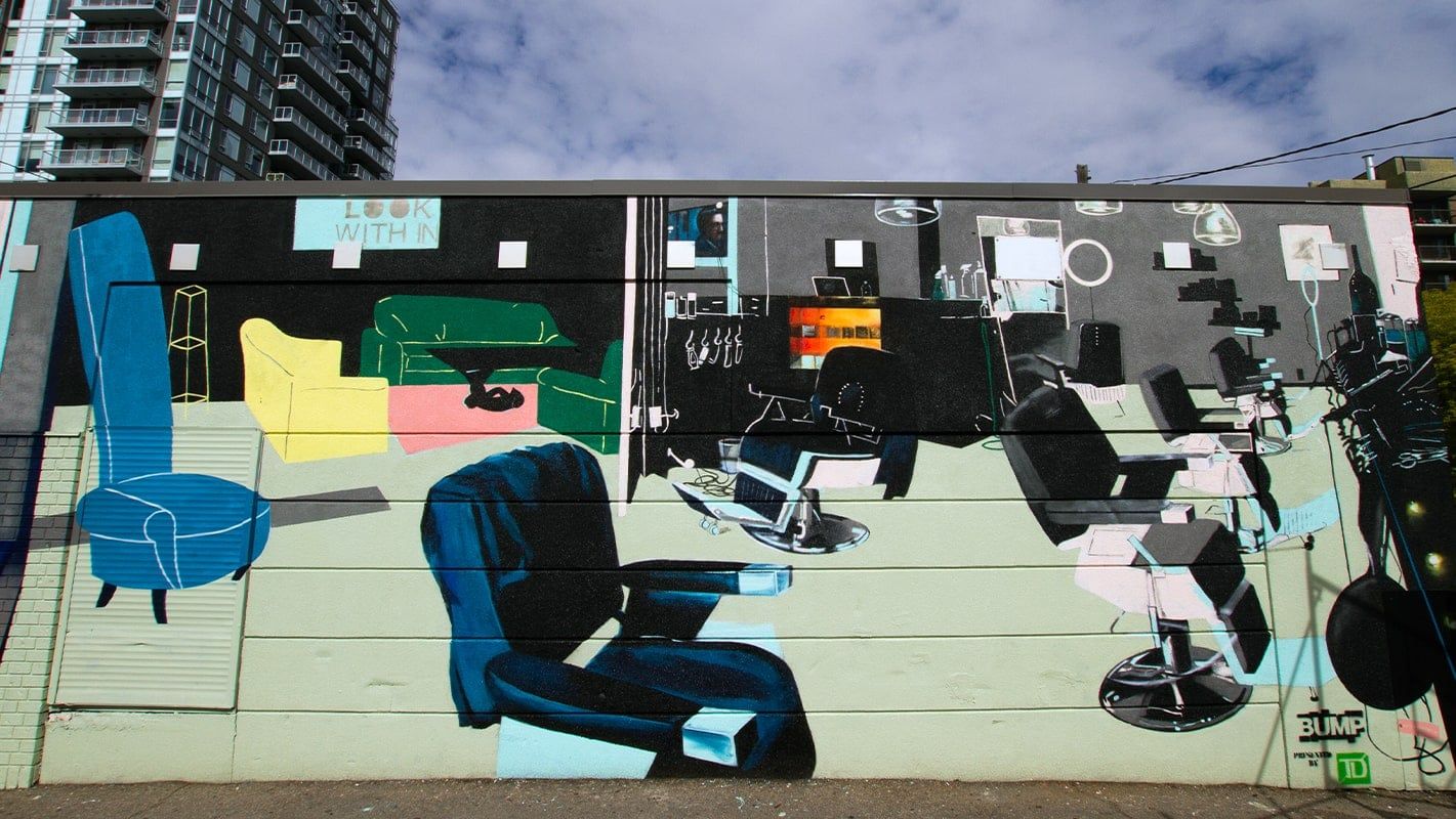 My BUMP mural was inspired by the business behind the wall. When I discovered the wall I was to paint I immediately went in to meet the business owner and took a few photos.