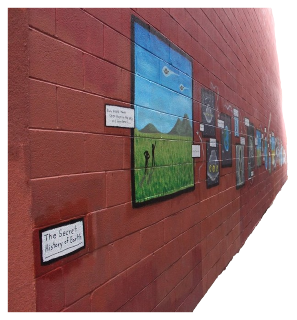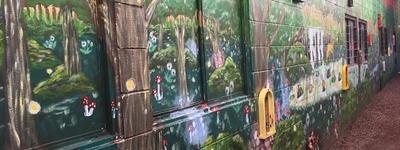 The colourful mural features fairy doors in a folklore forest.