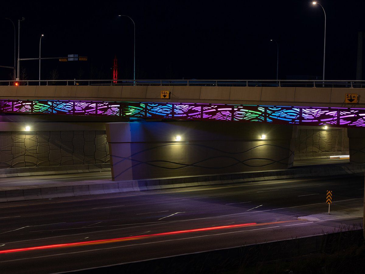 Inspired by motion, the sky, the site, and nearby waterways, laser-cut metal panels span Macleod Trail along the bridge while two towers mark the pedestrian path.