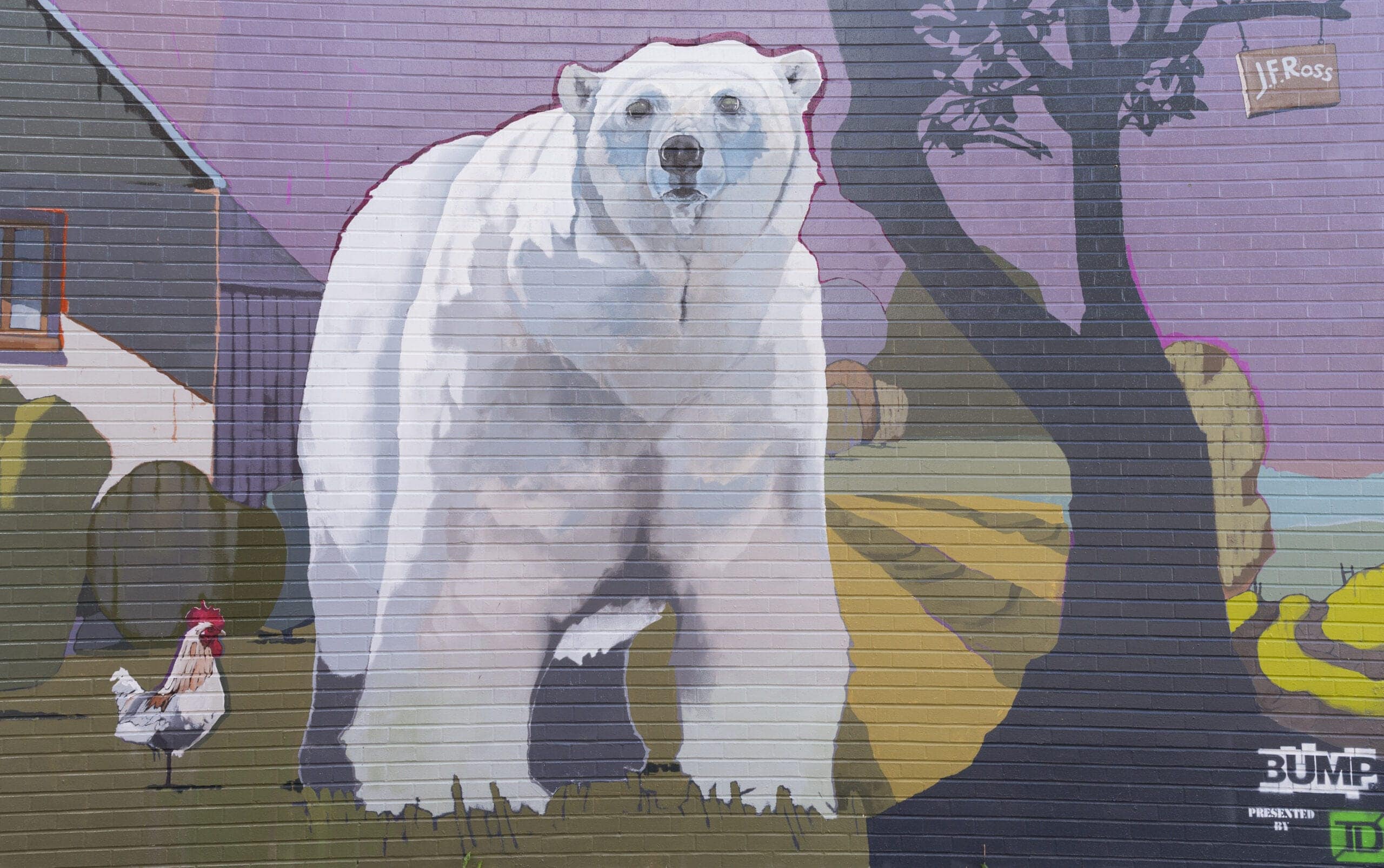 This whimsical and exaggerated image of a polar bear in a pastoral country scene intends to foster dialogue about habitat displacement and climate derangement out of the absurd juxtaposition of that bear in a place that he most definitely does not belong.