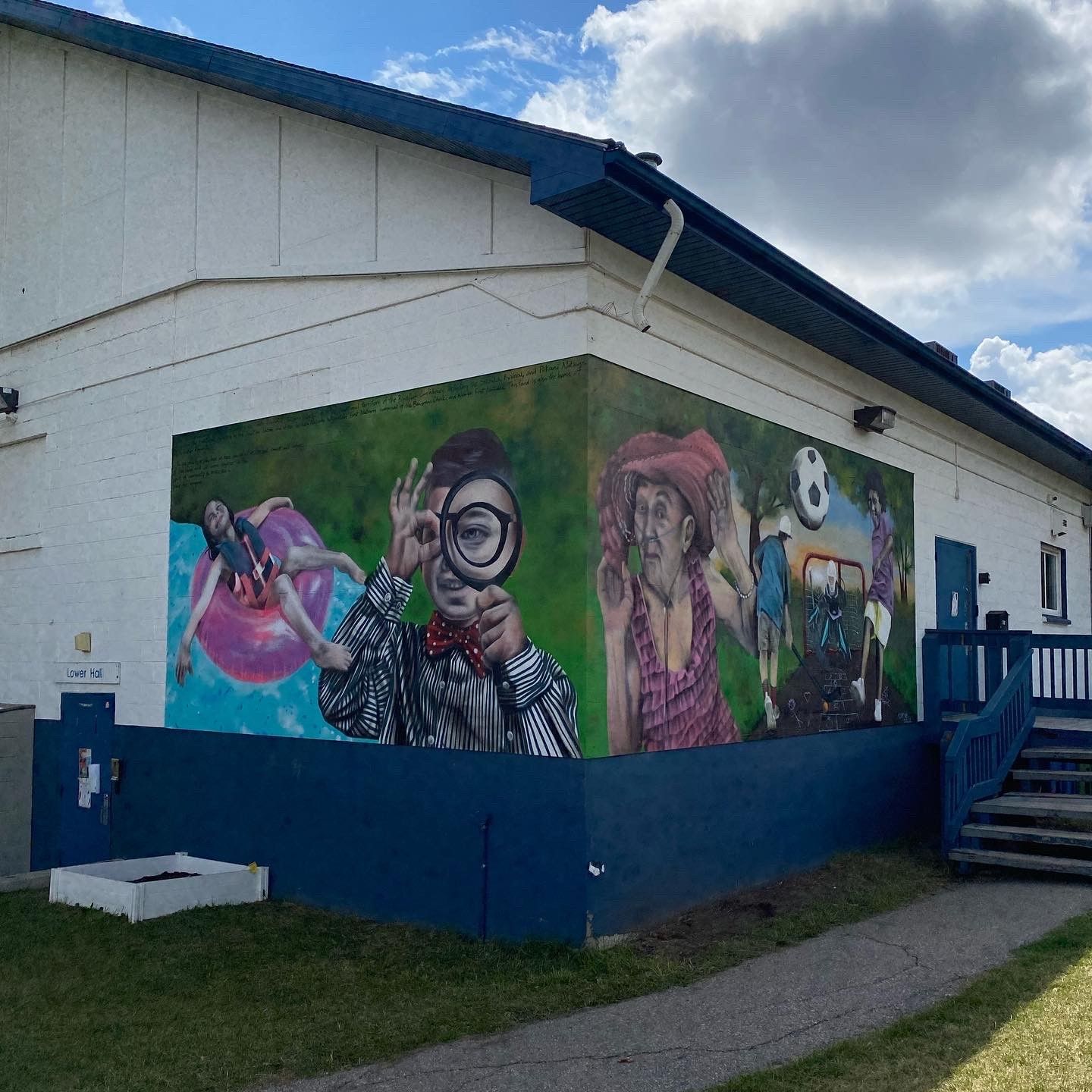 Only one person on the mural was based off a real community member: the lady in pink is Nina Sedorava, a vibrant community member who passed away in 2021. She was known for wearing bright colours.