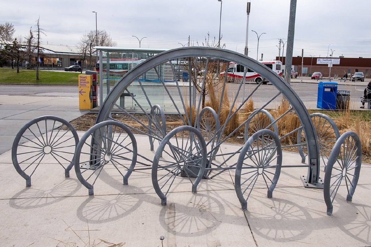 This functional sculpture serves as a bike rack near the busy Chinook LRT station and speaks to movement and making different choices for a better future.