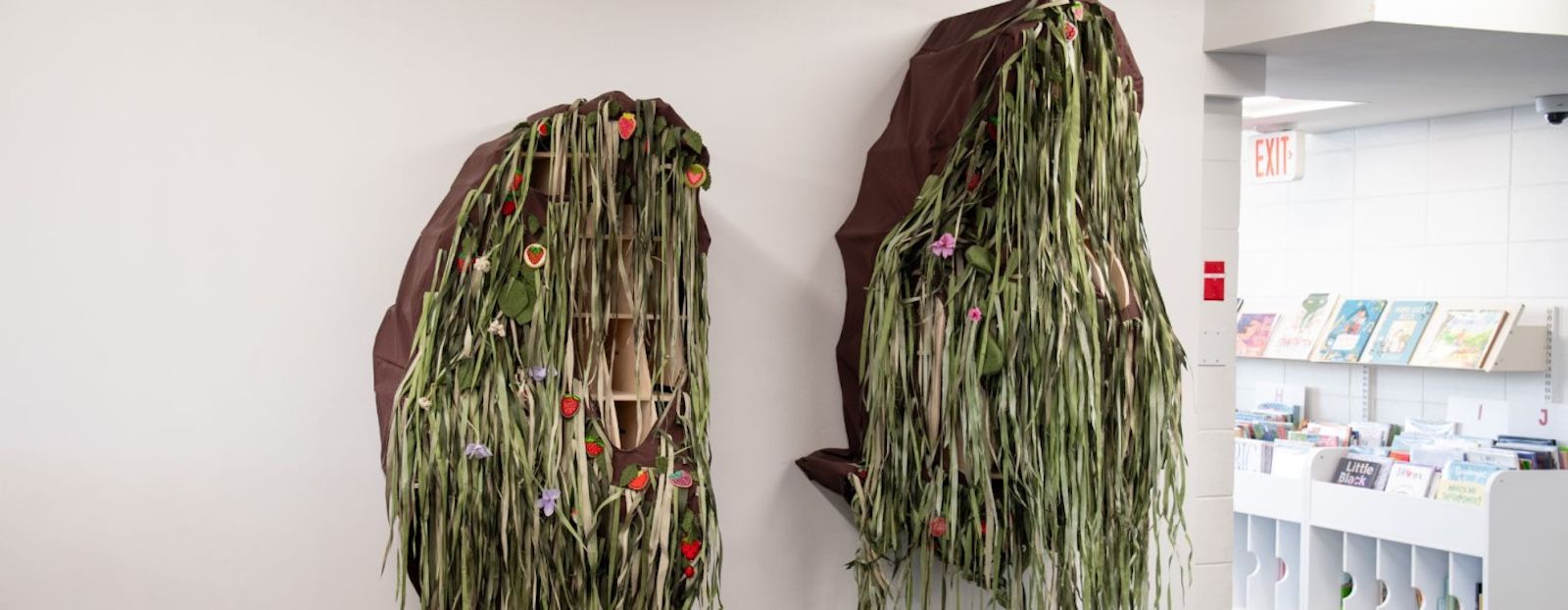 The berries are mounted onto a representation of Nose Hill Park — one of the highest points in the Calgary area and an area of great cultural importance to the Treaty 7 Nations. The undulating form of the artwork is the same undulating form of Nose Hill Park. Each textile plant on the piece — sweetgrass, wild roses, blue flax, wild plantain, and wolf willow — are native plants and hold meaning or have useful purposes.
