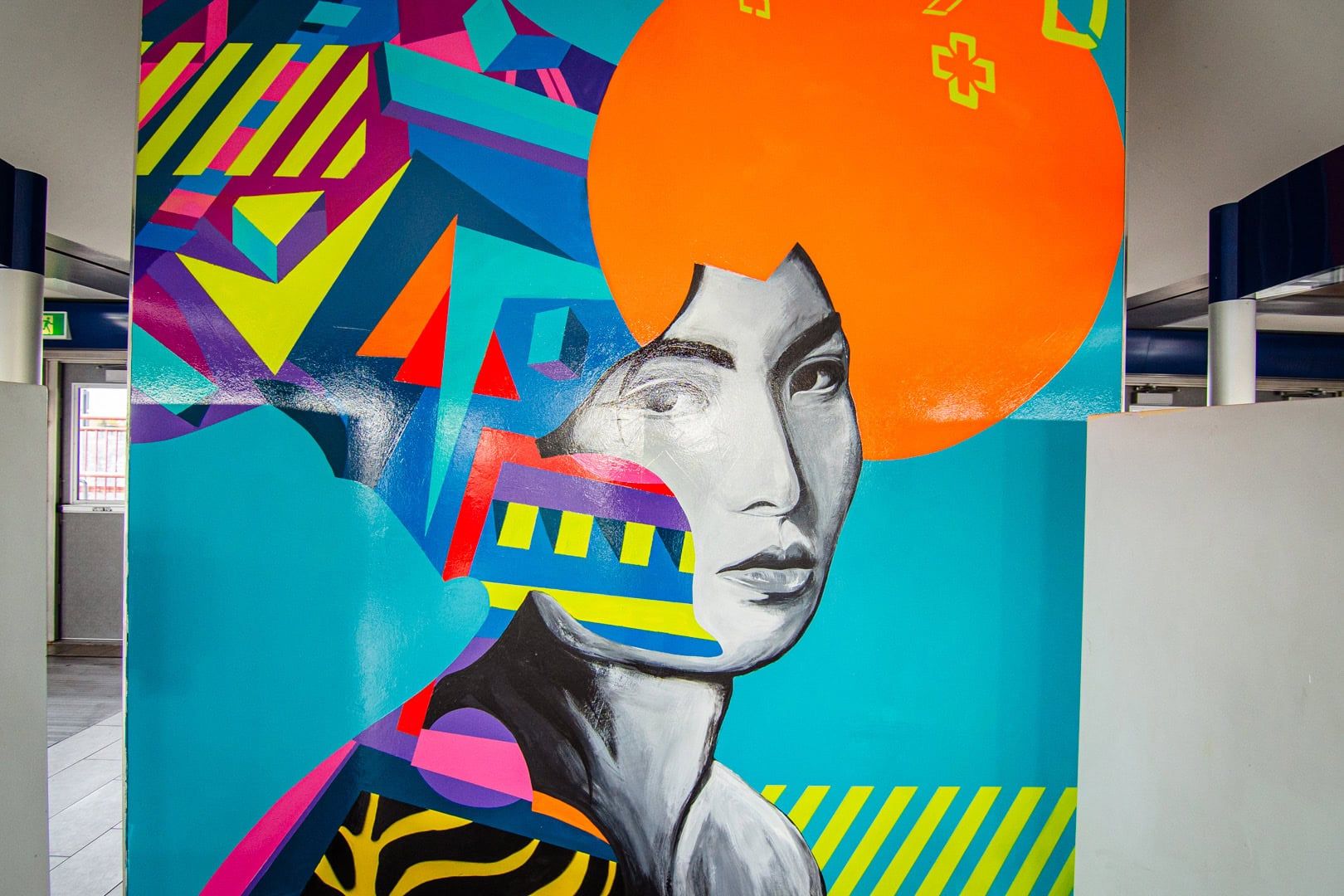 "Padayon, the Daydreamer" is a tribute to the extraordinary found within the ordinary, a celebration of the mundane evolving into the fantastic. At the centre of the mural is a woman, her upper body silhouette capturing the essence of commuters lost in thought as they await their journey. From the woman's head bursts forth a kaleidoscope of colours and shapes, a vibrant explosion of creativity and imagination. This transformative moment encapsulates the power of daydreaming, the capacity for our minds to transcend the everyday and soar into realms of possibility.