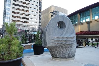 Roughly resembling a human head, this sculpture has marks on its surface, intended to represent the time periods referenced in the work's title: the past, present and future. Near the base of the sculpture, the rough surface suggests the challenges of the distant past. Marks near the middle of the sculpture are placed closer together, mixed with sections of smooth stone, suggesting that the present provides a way of life that is both complex and perhaps less challenging than the past. The upper portion of the sculpture is very smooth, suggesting the many possibilities of the future: what will humans do next?
