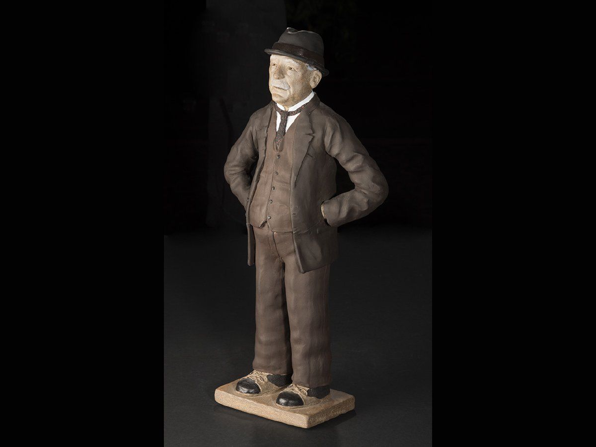 Patrick Burns was enormously influential in Western Canada. In 1896, he was the first man to transport livestock on the newly completed Canadian Pacific Railway. His entrepreneurial acumen in all sectors of the beef industry made him wealthy. Burns was also an Alberta senator and one of the Big Four who founded the Calgary Stampede in 1912. Created by prominent Métis artist David Garneau, a well-known contemporary artist, curator, writer, and professor, this ceramic sculpture is part of a series of five figures representing Alberta's past. In 1984 when he was commissioned to create sculptures of historic Calgarians to commemorate Calgary's 100th birthday, he was a 22 year-old student. At the time he was greatly influenced by the small-scale character studies in ceramic by Saskatchewan artist Joe Fafard.