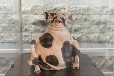 "Pete Pig" is a friendly fellow who lives in one of Calgary's many Plus-15 walkways. He sits cross-legged in his case, just waiting for a fellow citizen to stop by for a chat.