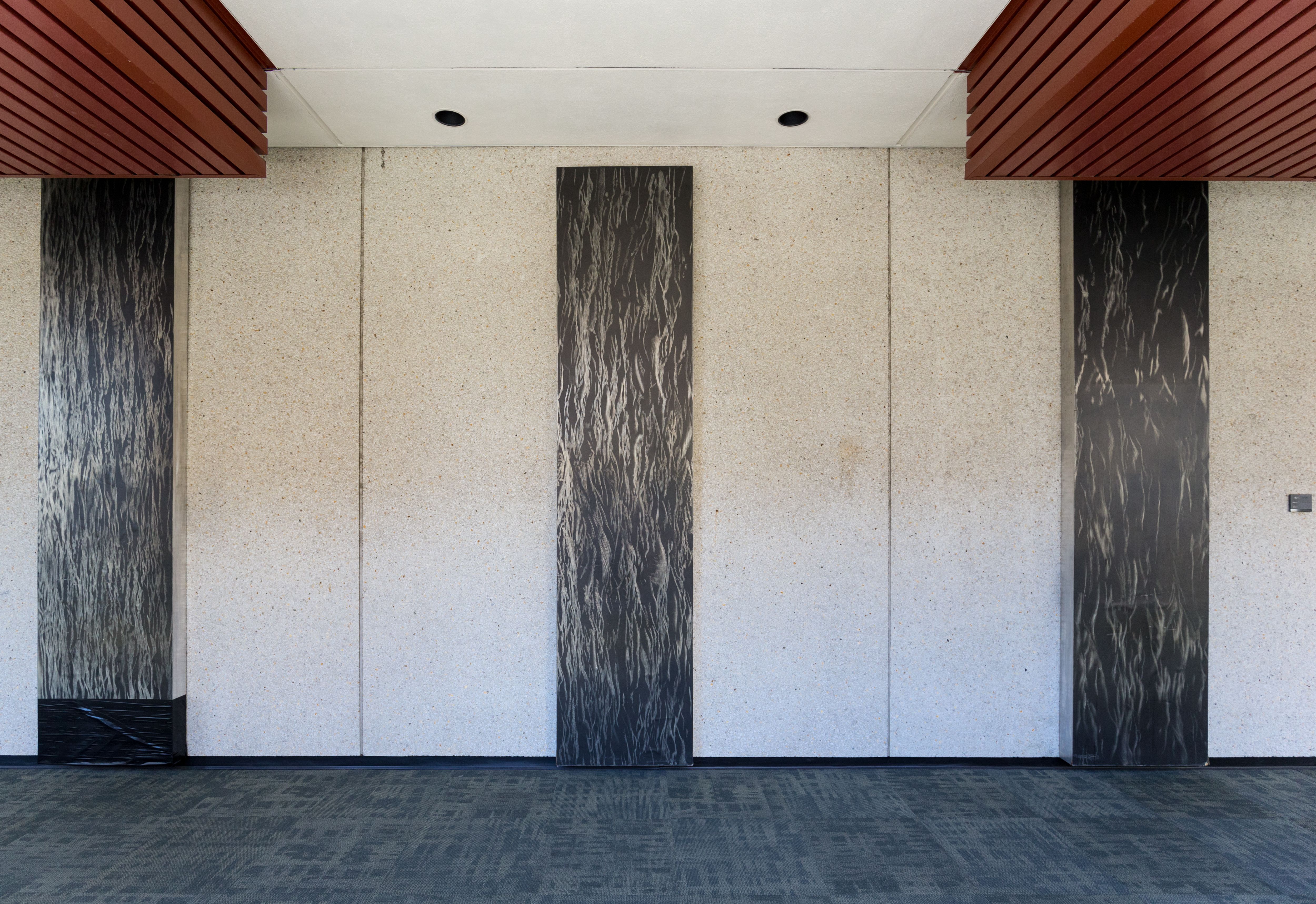 Blake Senini's three-part work, "Pristine", brings images of nature inside to one of Calgary's many Plus-15 walkways. Layering and combining images of trees and oceans, the artist has created a work that offers subtle reminders of the natural world.