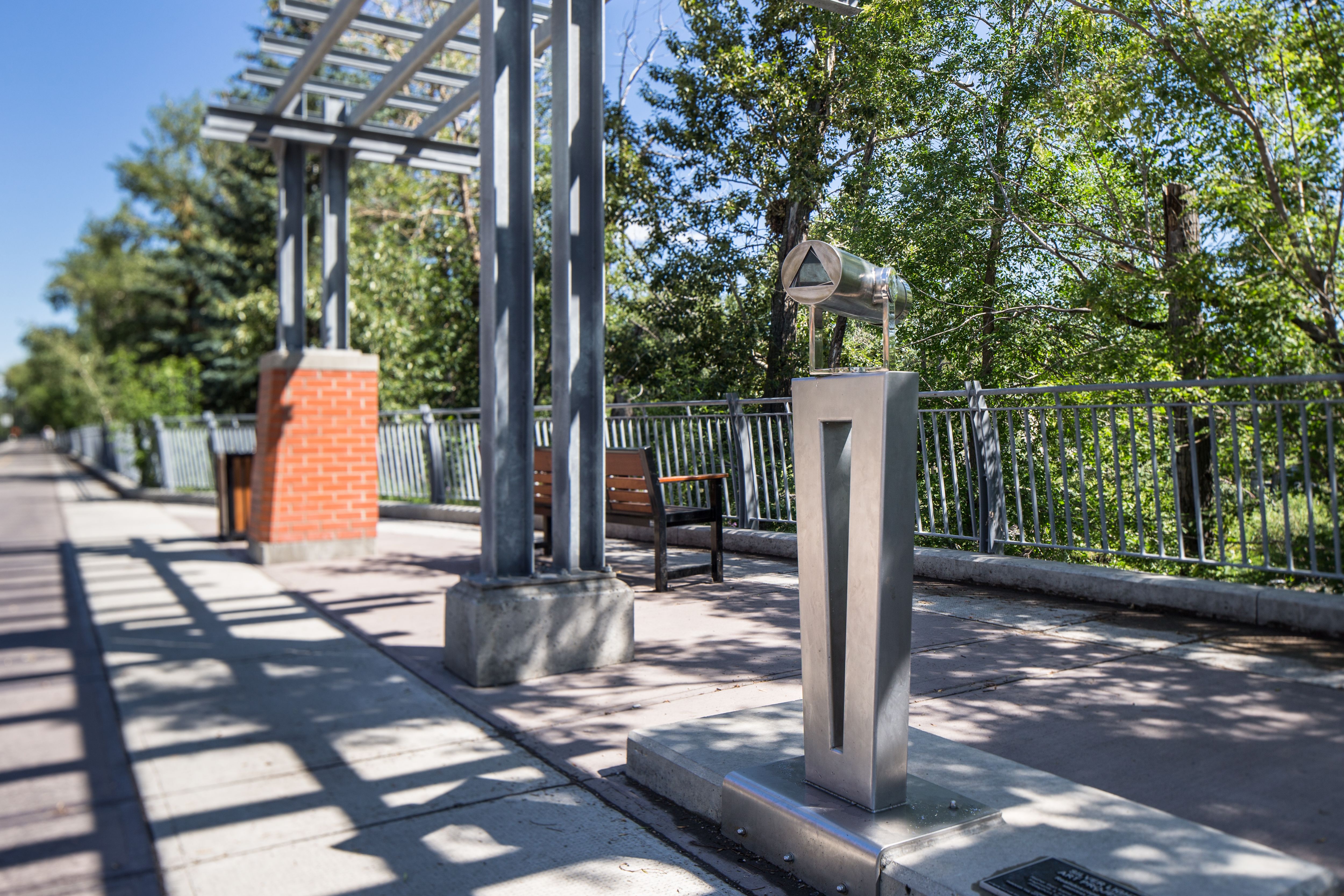 Looking through the viewfinder the reflected surroundings are accented by the ever-changing motion of nature and people around this site. The artist believes the use of prisms lends itself to interactive situations and community involvement, and allows the viewer to engage in the act of transition and change. That we are living in a world which is continually being rearranged and reassembled, much like the way prisms rearrange our point of view in Realidoscope.