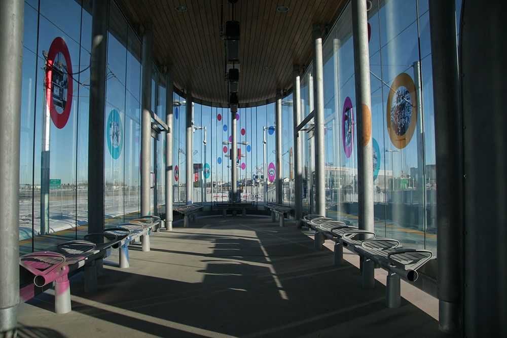 Located in the glass heating shelters on the LRT platform, these spheres of colour appear to be dots from a distance, dancing around the glass. But as viewers draw closer it is clear these dots contain photographs of people living everyday life. A vital component of this public art project was the inclusion of community residents in the creation of the piece. One of four installations located at the McKnight/Westwinds LRT station, Recollections invites the viewer to learn more about the community members living in the area. A call went out to Calgarians living in the N.E. to contribute images of their lives. From a historical photograph of Mrs. Brown with her brand new stove to an image of a resident's parents married in India in 1945, these photographs provide viewers a glimpse into significant personal, historical and community events; all of the elements that make this community a unique and special place.