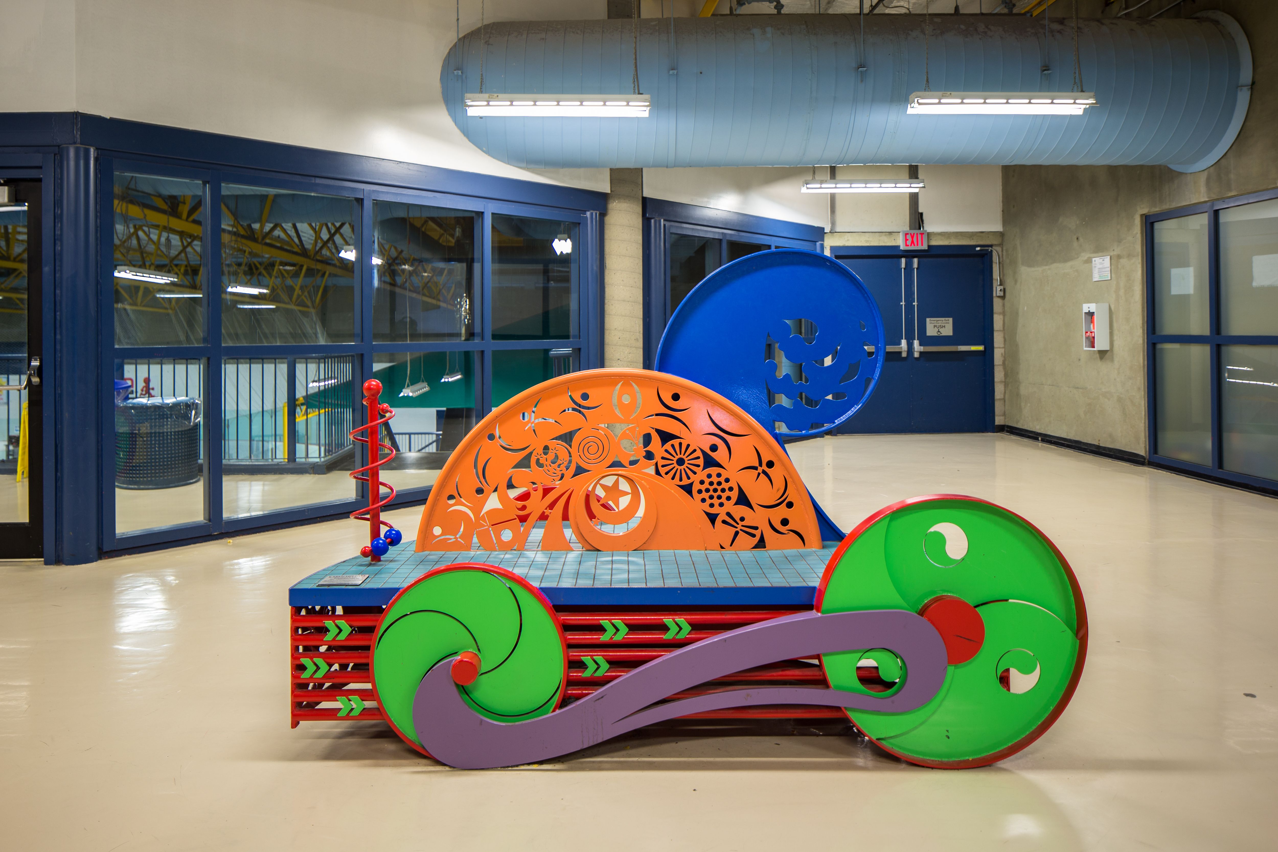 These functional sculptures use shapes and kinetic forms to provide a sense of movement, energy and vitality to connect the work to the theme of recreational activity. Bold colours represent the cultural vitality of the Centre, while images and motifs reflective of cultural groups are incorporated within, referencing the diversity of the community users of this facility. Blue waves, Buddhist wheels, figures in motion and interactive activities invite you to sit, pause and maybe even play.
