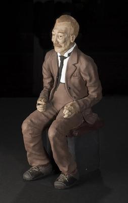 Robert Edwards, the maverick publisher and editor of Calgary's Eye Opener newspaper from 1902-1922, was intense, witty, inventive and often combative. He was a tireless defender of his community and could be a fierce opponent. In this small character study, the artist imagines him in an unguarded moment at the end of a working day. Created by prominent Métis artist David Garneau, a well-known contemporary artist, curator, writer, and professor, this ceramic sculpture is part of a series of five figures representing Alberta's past. In 1984 when he was commissioned to create sculptures of historic Calgarians to commemorate Calgary's 100th birthday, he was a 22 year-old student. At the time he was greatly influenced by the small-scale character studies in ceramic by Saskatchewan artist Joe Fafard.