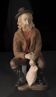 Sam Livingston left his native Ireland at sixteen to become a gold prospector, an adventurer, a fur trader and finally the first farmer and rancher in the Calgary district. Garneau's portrait brings him to life as a rugged older man, dressed in heavy sweater, a hat and high boots. One huge hand grasps his forearm, introducing a sense of tension into an otherwise casual seated pose. He is looking up and appears to be talking. Created by prominent Métis artist David Garneau, a well-known contemporary artist, curator, writer, and professor, this ceramic sculpture is part of a series of five figures representing Alberta's past. In 1984 when he was commissioned to create sculptures of historic Calgarians to commemorate Calgary's 100th birthday, he was a 22 year-old student. At the time he was greatly influenced by the small-scale character studies in ceramic by Saskatchewan artist Joe Fafard.