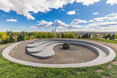 The artwork only reveals itself to those who make the trek up to the top of the hill. It consists of two parts, the pod and the seed. The pod is a concrete structure integrated into the earth forming a large oval shape that provides three seating platforms. The seed is in the centre of the pod and references the seed head of a native prairie wild flower.