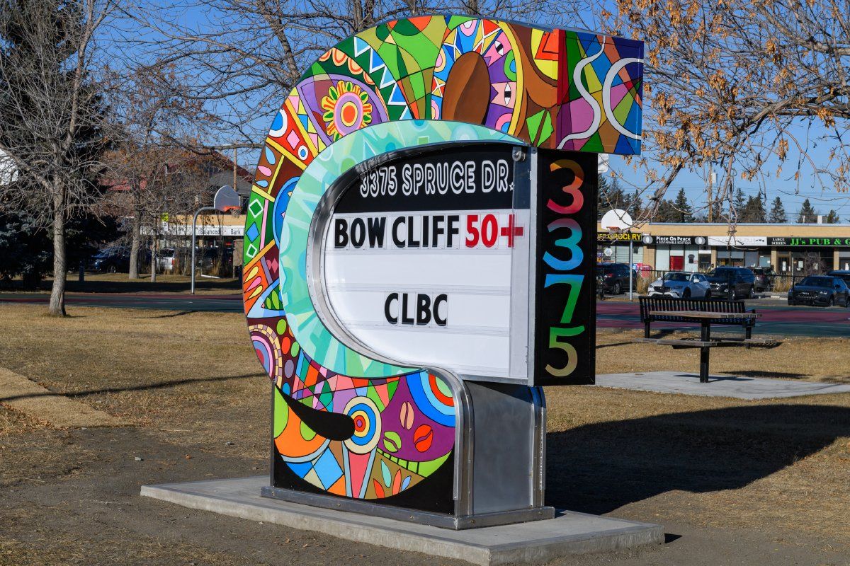 A collaboration between Calgary artists Oksana Kryzhanivska and Sisay Shimeles, the designs for the artwork were conceived during multi-cultural art workshops with Spruce Cliff community members that focused on cross-cultural and traditional ways of art making. With the goal of uniting multicultural artists and building stronger community ties that would highlight Spruce Cliff's identity, participants produced paintings that were incorporated into the final art pieces. The workshops allowed residents to make a permanent mark in the Spruce Cliff community while celebrating and bringing together different cultural perspectives. In addition to incorporating community member's paintings, the artists lent their culturally inspired imagery to this work. During the day, the sign shows a bright and diverse collage. At night, the backlit artwork gives nod to connectedness through cultural identity. Active and passive users of this facility will all see themselves reflected in these paintings which enliven the architecture of the centre's main wall. Spanning almost 90 feet, this multi-painting installation features skaters, hockey players and spectators, ensuring visitors know about the diversity of activities available throughout the complex. Similarly, colours and stripes which are incorporated throughout the composition were directly inspired by the markings found on the gym floors within the facility; animating the motion captured in the figures, providing a sense of spontaneity and fun.