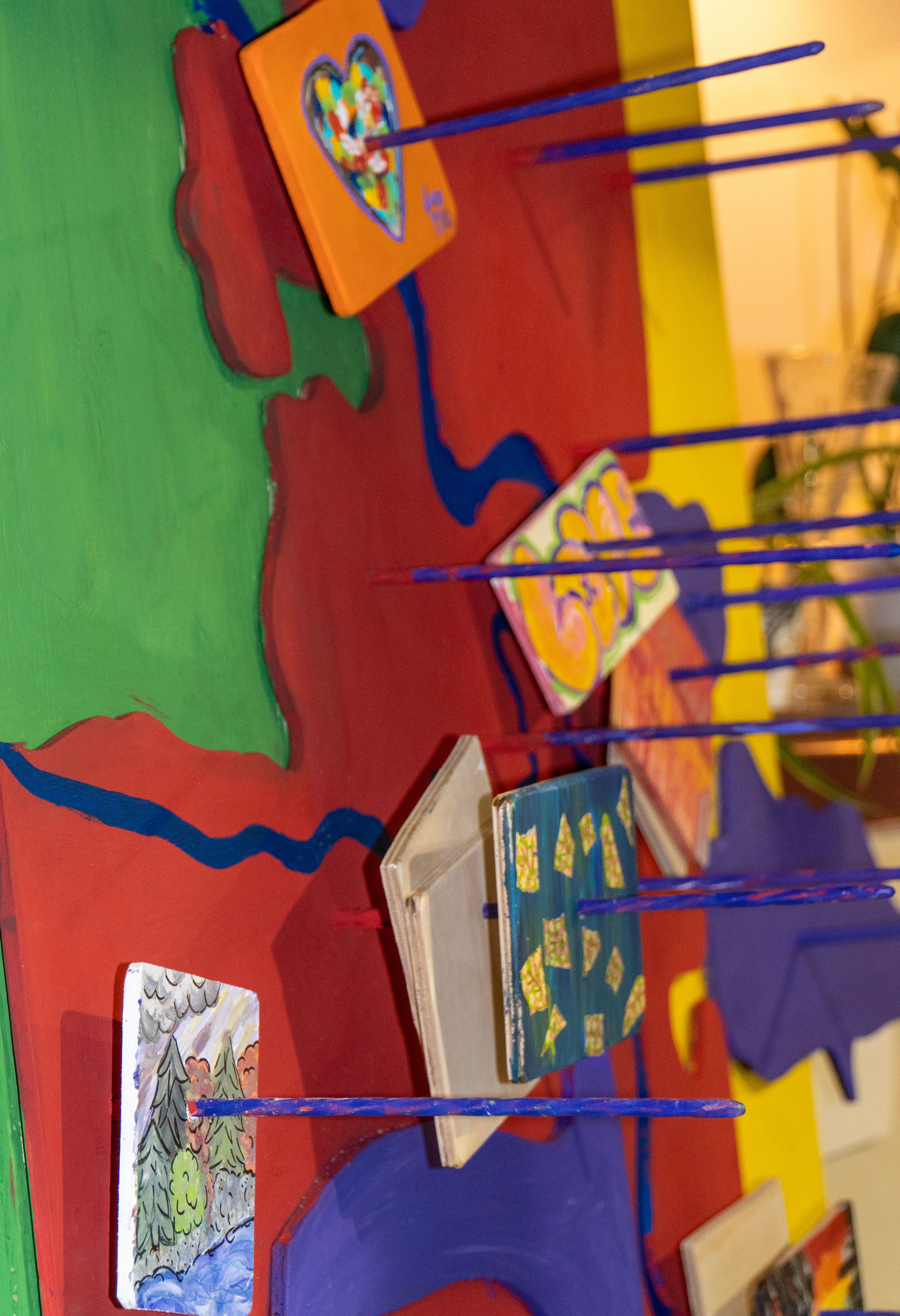 Community members were invited to paint their own piece of a collaborative mural that celebrates the landscape, people, and stories of our community. Artist Matias Martinez developed the concept for the mural and led a series of workshops for community members to create individual painted elements.