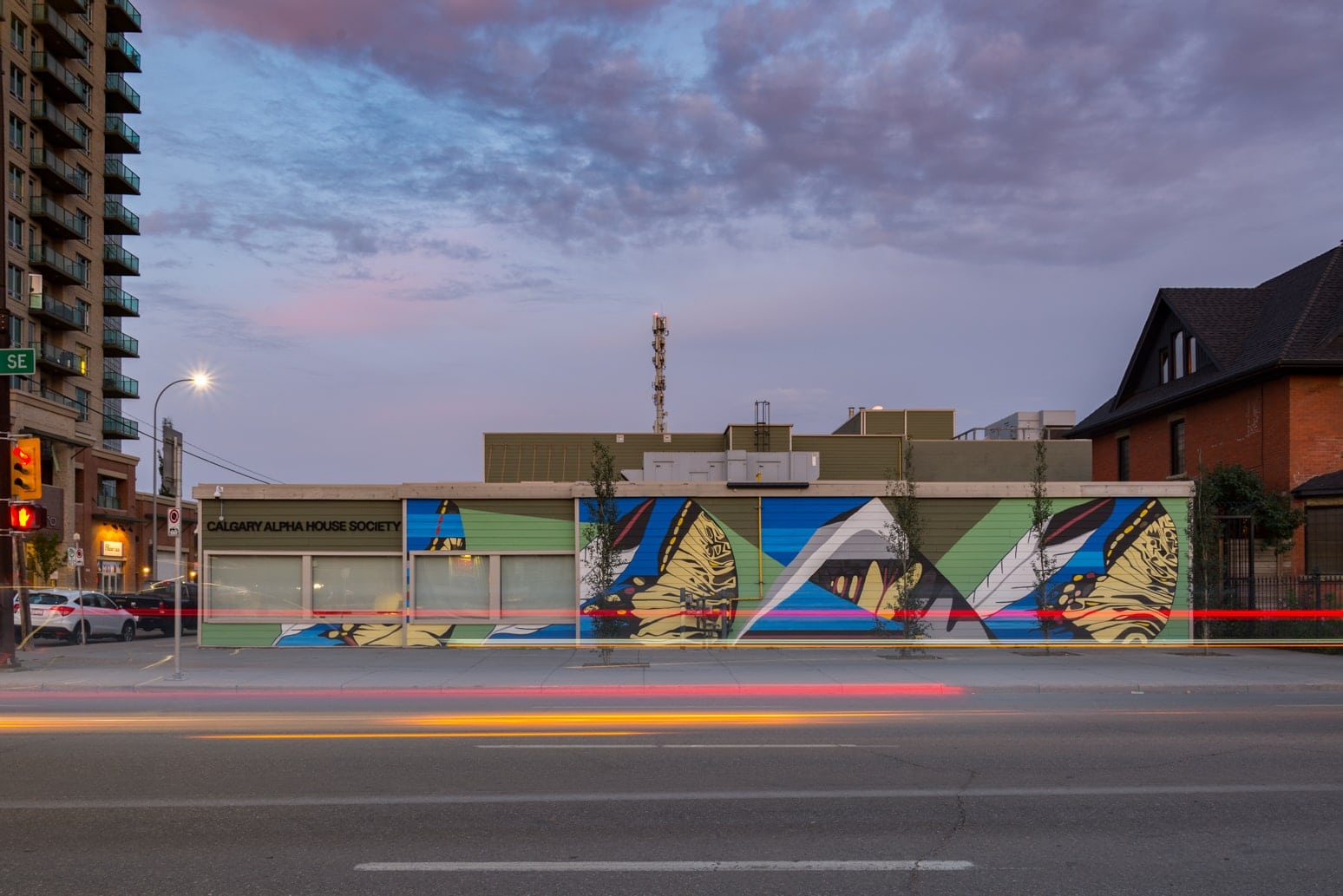 Alpha House provides a safe and caring environment for individuals whose lives are affected by alcohol and other drug dependencies. “Strength and Fragility” is an abstract landscape of eagle feathers and swallowtail butterfly wings. I chose these items of flight to connect to uplift, and to represent the clients and service providers at this building. The abstraction plays into how things aren’t always pretty and whole, but the broken-up pieces all belong together to transform holistically. This mural was commissioned through BUMP who are doing great work to make space for artists and community groups.
