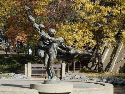 Created by American artist Stanley Bleifeld, famous for his figurative bronze sculptures, this joyous work is both realistic and fanciful. While the figures are sculpted with great precision, the dynamic composition magically suspends time. Propelled by the centrifugal force set in motion by their parents' energetic swinging, the children seem to fly. The artist described the subject as "self-explanatory, and if it shows some exuberance and joy, it was what I felt about this phase of life." "The Alberta Family" was a gift to the City of Calgary from the Devonian Group of Charitable Foundations. One of the Group's members, Donald Harvie, viewed a smaller version of this sculpture while travelling in California. He later commissioned the larger sculpture you see here. Artist Stanley Bleifeld (1924-2011) was a well-known American sculptor. Although he began his career as a painter, a trip to Italy inspired him to focus on sculpture. His works can be seen in several American cities, including Washington, DC, and Richmond, Virginia.