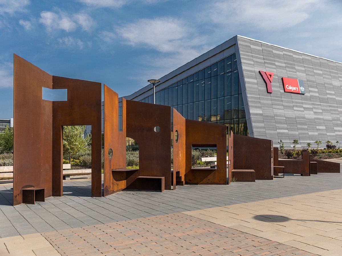 Made out of weathering steel, a series of progressively larger steel walls zig zag along the pathway implying a series of connected and open rooms. Windows and shelves of various heights and shapes are cut out of the steel. It encourages visitors to interact with the artwork and each other, becoming a place of gathering for this community.