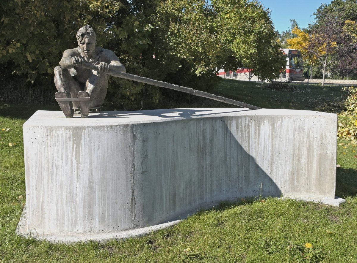 John Lecky contributed to Canadian sports in a number of ways, including as a rower in the 1960 Summer Olympics in Rome, Italy. Along with his teammates, Lecky won a silver medal at these games in the Men's Coxed Eights. Some 24 years later, he was Canada's Chef de Mission for the 1984 Summer Olympics in Los Angeles, United States. This sculpture shows the athlete in a very dynamic pose. He is just about to pull back his oar, perhaps helping to propel his team to victory. "The Oarsman" was created by Robert Spaith, a Calgary-born artist. Although he creates sculptures of a variety of subjects, he is best known for works depicting horses and aspects of cowboy culture.
