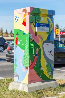 The artist aimed to capture the happy, family-oriented, outdoorsy and active community through the use of bright colours in a collage style design, in hopes of bringing joy to that street.