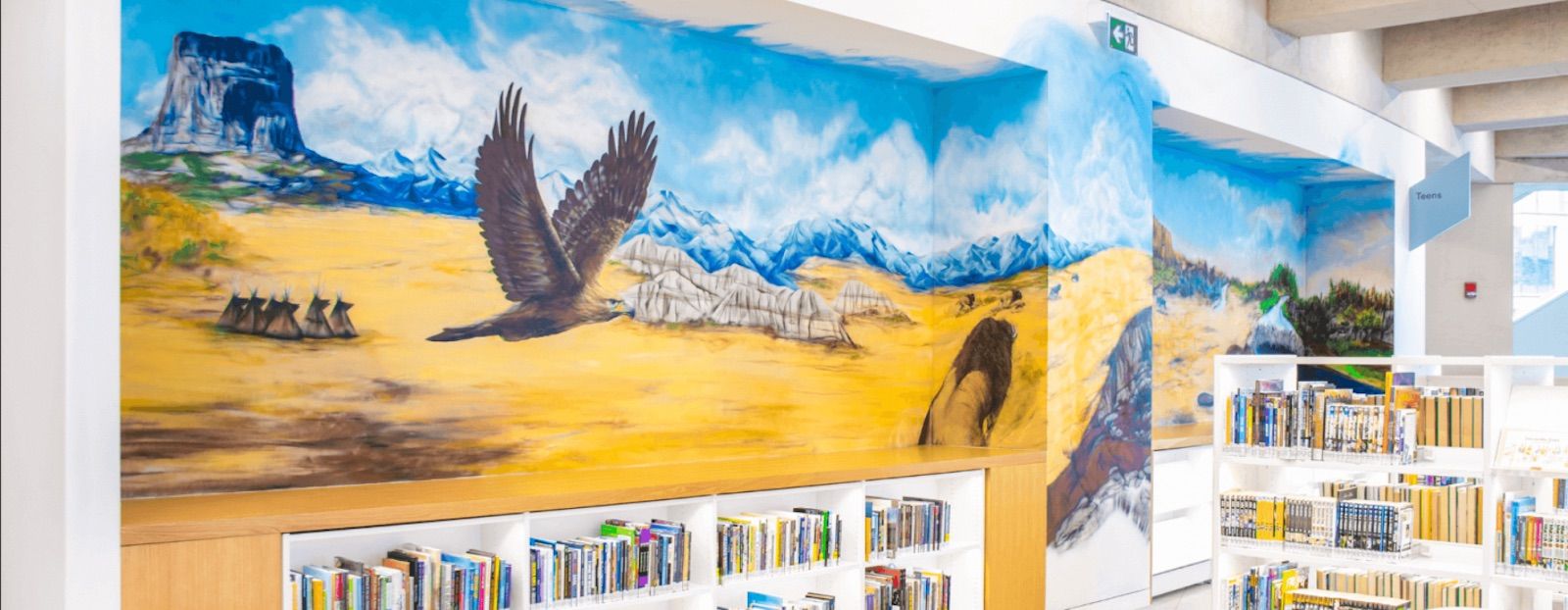 A traditional landscape bridges the gap between the panels, symbolic of the limitless potential of nature. Community leaders and Elders were consulted to determine the images that would represent their communities within this shared Treaty 7 landscape.