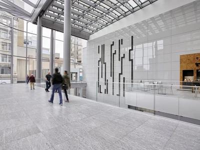 The Trees is a composition of abstract shapes created in response to the scale and play of light and shadow in Brookfield Place’s dynamic James K. Gray Galleria. When seen from afar, the artwork appears as a minimal graphic drawing, but as one approaches, intricate textures and repeating patterns are revealed. Within each hand-finished, square metal tile is a complex three-dimensional surface that transforms with the environmental ebbs and flows of the day.