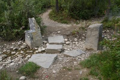 In summer, this normally dry stream flows with water and these large stones provide a pathway across. Engraved on five of these stones are phrases in Inuvialuktun and English that are personal to the artist.