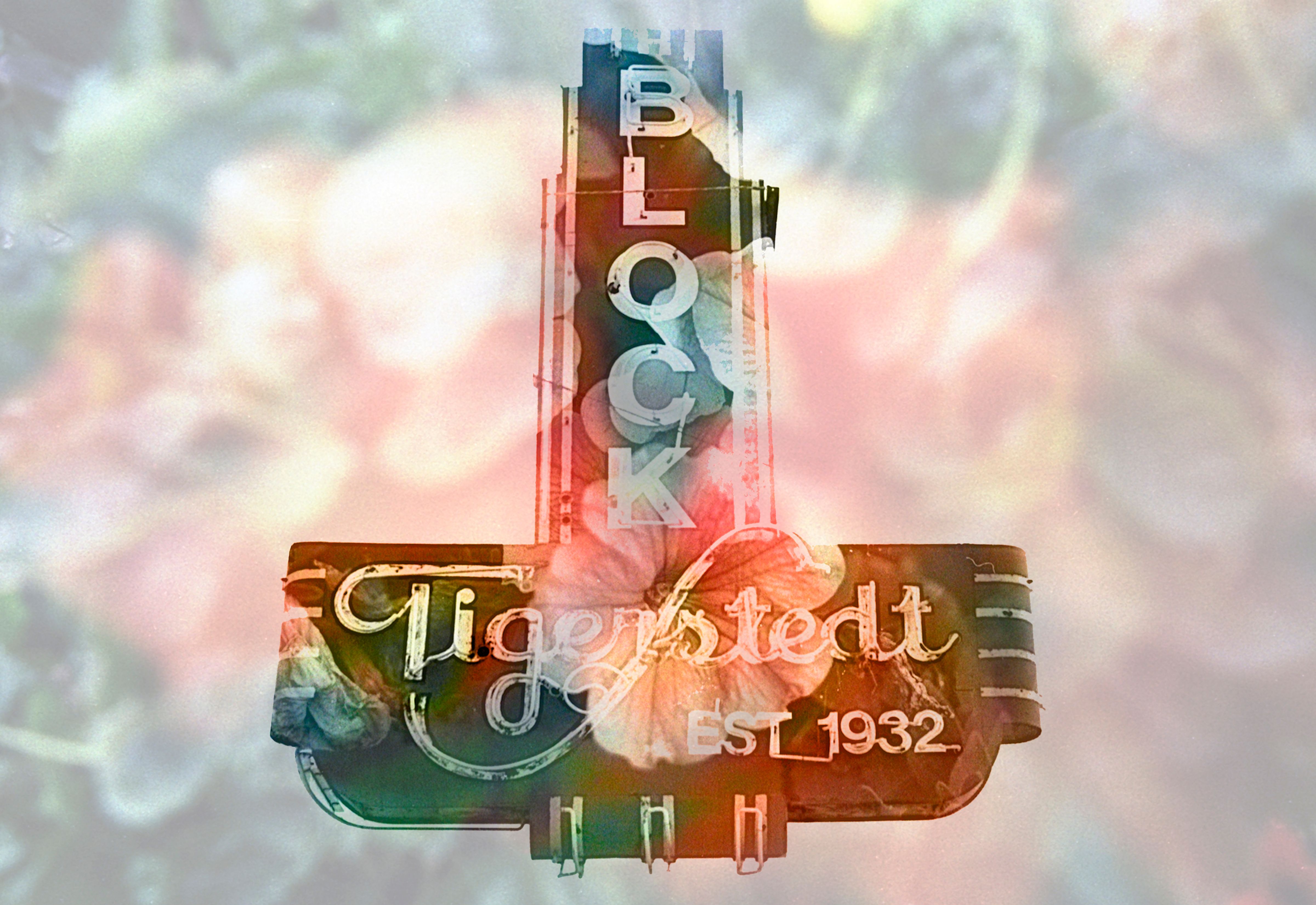 The Tigerstedt is a piece that began as a double-exposure photograph. The flowers inside the T-shaped sign are double exposed on film, taken from the flowerpots in the same location as the sign. I wanted to honour this sign and location because part of the building was built for a photography studio for Albert Tigerstedt, a local photographer, in the 1930s. I marvel at the sign’s Modernist elements, that it still exists, and I wanted to create a piece that centres on it. The floral patterns in the background act as a symbolic appreciation of the inverted T-shaped sign and history of the building.