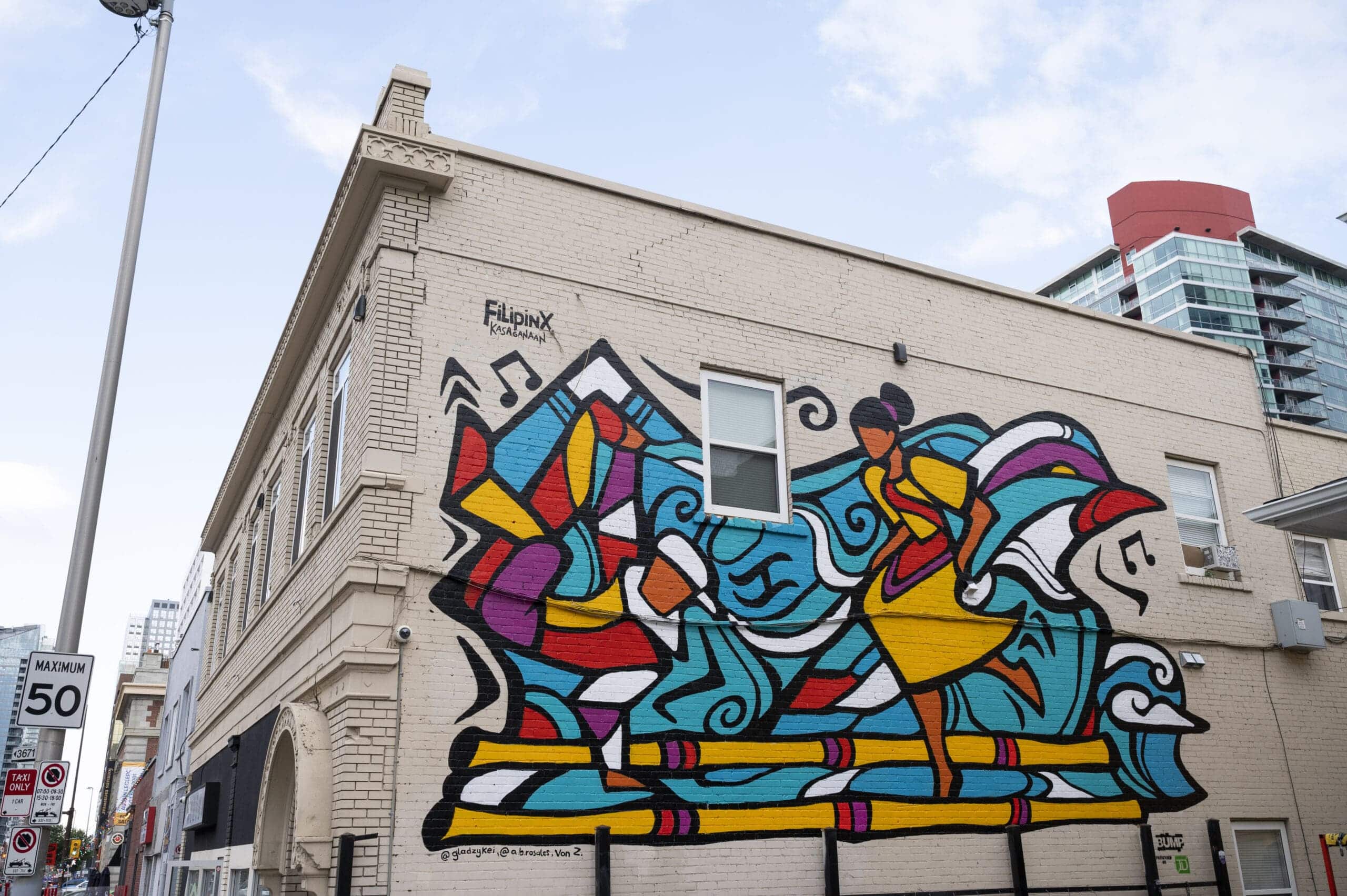 This mural highlights the importance of dance in FilipinX culture through the ages. The FilipinX dancer on the right is doing a traditional dance called the “Tinikling”, mimicking a bird’s speed and grace as it navigates bamboo poles. The bird behind the woman is known as “Tikling” which is what inspired the traditional dance.