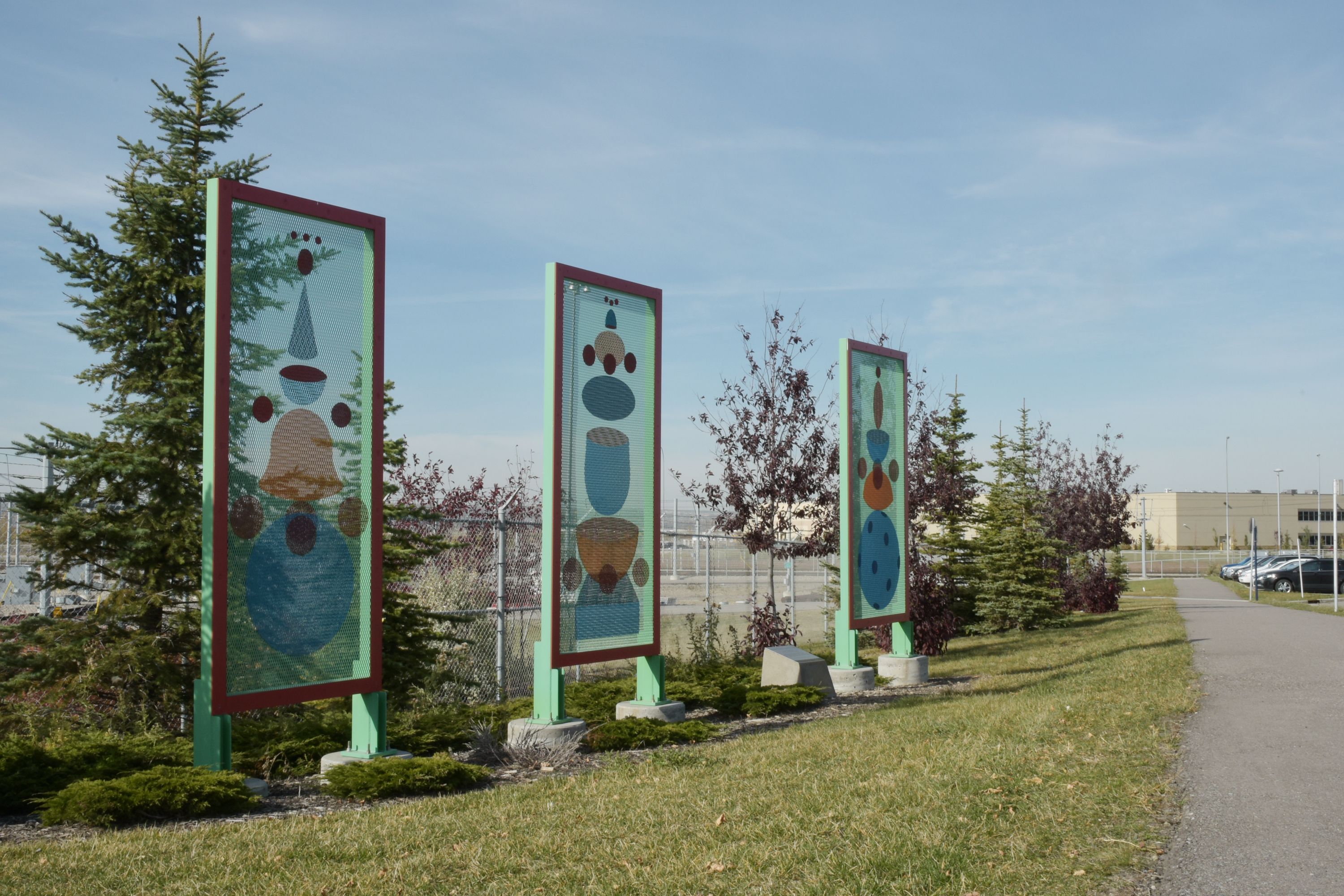 Standing over seven feet in height, the images on the Quilts are directly related to the shapes and forms found in the Topiary sculpture located in the plaza area of the LRT station. They also reference the images dotted across the glass heating shelters on the station platform, continuing the playful dialogue the artists have featured throughout this site. References to the Blackfoot Nation have been included through the artist's use of circle motifs, an element commonly found in many Blackfoot creations. The Blackfoot are one of the oldest aboriginal nations to inhabit Calgary, and the artist's inclusion of this imagery acts as a way to continue their historical connection to this site and to the community of Calgary as a whole.