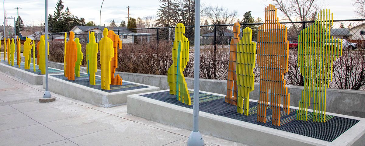 Enlivening the experience of the Centre Street LRT station are 30 sculptural commuters standing alongside transit users, collectively waiting for the next train to arrive.