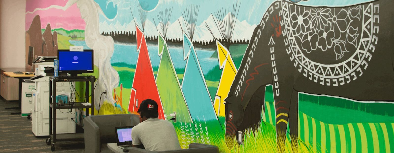 The concepts behind Treaty 7 Art Mural are balance, mentorship, learning, and staying connected to Treaty 7 lands we share and protect.