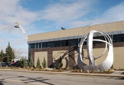 Under the Helmet is a large aluminum sculpture of a firefighter's helmet, constructed from the characteristics of retired City of Calgary Fire hoses.