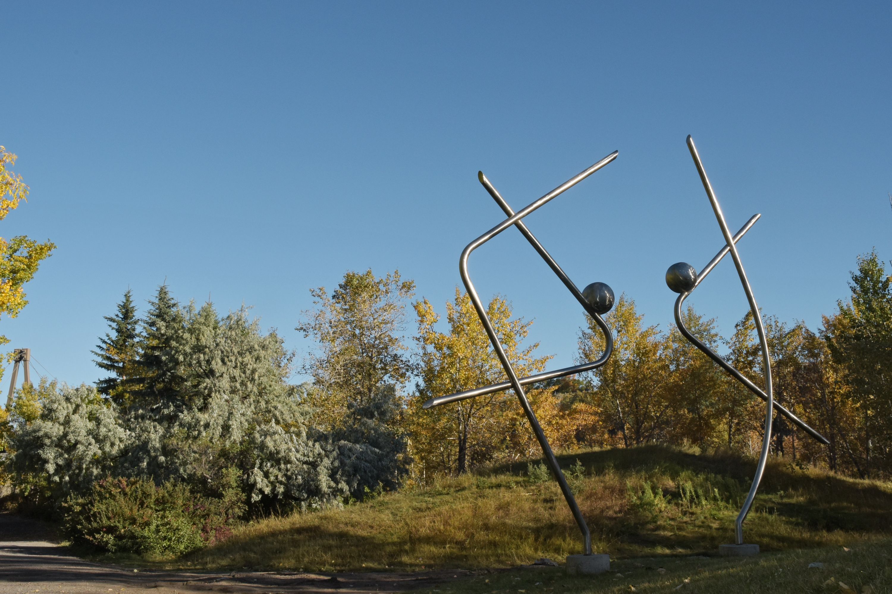 Like a linear drawing in space, each section is made up of a vertical steel rod, intersected by an open-ended triangular shape, topped by a small ball. Although they share structural components, the parts are not identical. The more emphatic bend of the larger straighter form is reciprocated by the gently curving arch of the smaller form, like partners bowing to each other in a graceful dance.