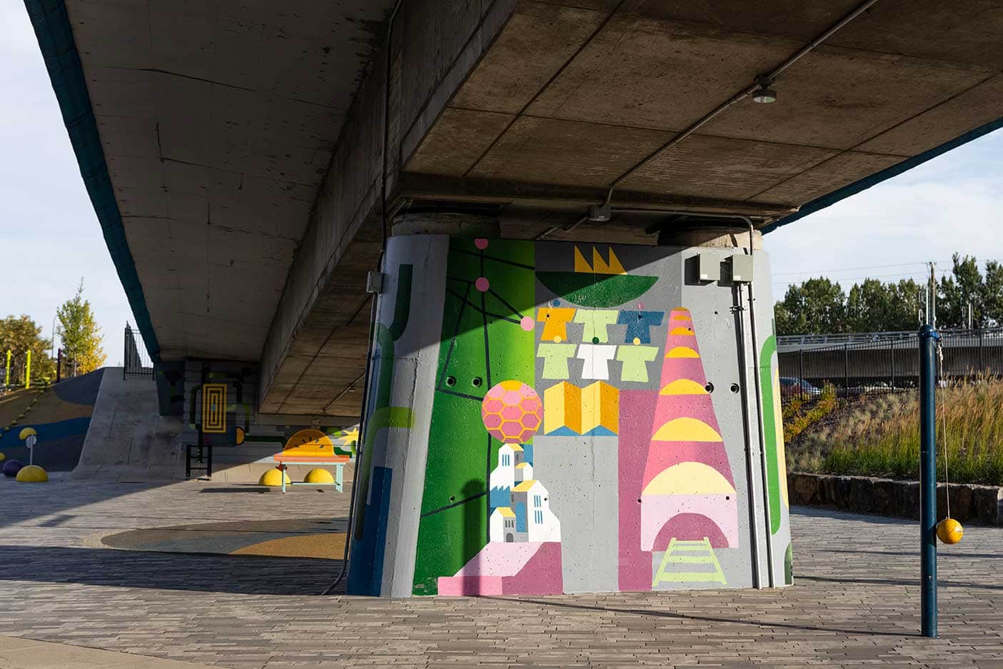 The murals were painted on the abutment supporting the flyover as well as 3 pillars that support it. I wanted to represent people moving through their city with visual storytelling that highlights Calgary geography, landmarks and architecture. By using simple geometry and suggesting everyday scenes in a semi-abstract way, I’m hoping the observers make up their own interpretation as they pass by the pillars.